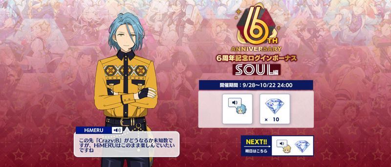 | 10月05日 | ボイス「六周年の挨拶(HiMERU)」 ダイヤ×10 |
