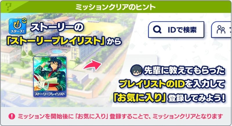 | クリア方法 | ストーリープレイリスト機能で先輩のプレイリストをお気に入りしよう! | ||