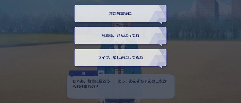 | 3 | 日も短くなってきたし、ライブとか卒業式の準備してるみんなもそろそろ帰る時間だろ。(名前)も用事がないならもう帰った方がいいぞ | ||
