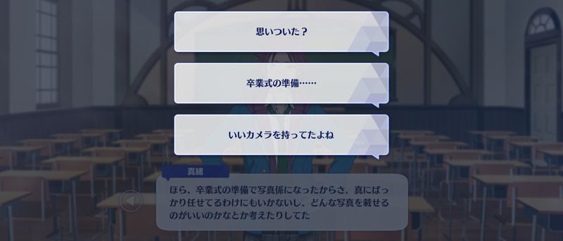 | 1 | ほら、卒業式の準備で写真係になったからさ。真にばっかり任せてるわけにもいかないし、どんな写真を載せるのがいいのかなとか考えたりしてた | ||