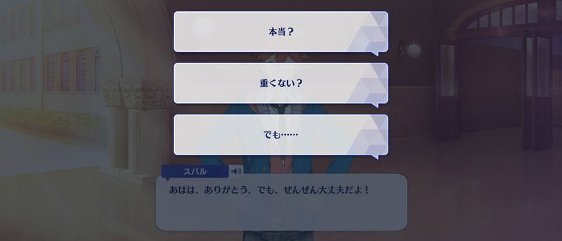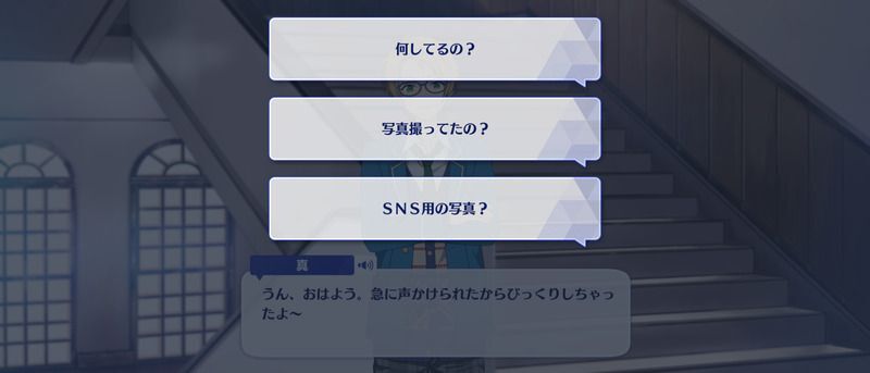 | 3 | あっ、そうだ。立ち話しててもなんだし、(名前)も一緒に来ない? 時間あったらでいいんだけど。一緒なら楽しそうでいいかなって | ||