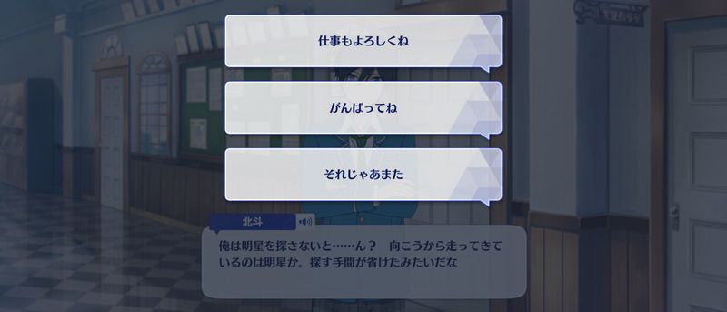 | 3 | 俺は明星を探さないと……ん? 向こうから走ってきているのは明星か。探す手間が省けたみたいだな | ||