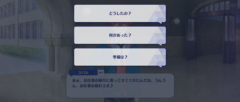 | 1 | あぁ、お仕事の帰りに寄ってきてくれたんだね。うんうん、お仕事お疲れ様♪ | ||