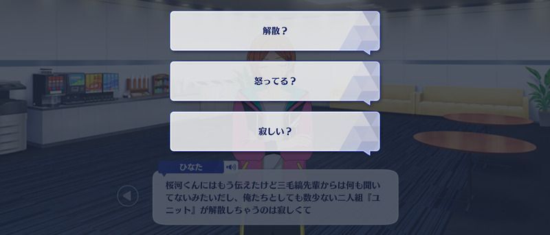| 3 | それで……もしよかったらなんだけど、(名前)さんにも協力してもらえないかな? 三毛縞先輩といろいろあったみたいだし、よかったらでいいんだけど | ||