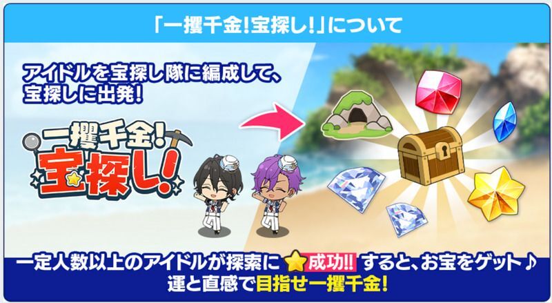 | アイドルを宝探し隊に編成して、宝探しに出発! 一定人数以上のアイドルが探索に☆成功!!すると、お宝をゲット♪ 運と直感で目指せ一攫千金! | |