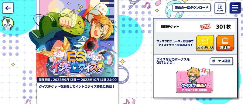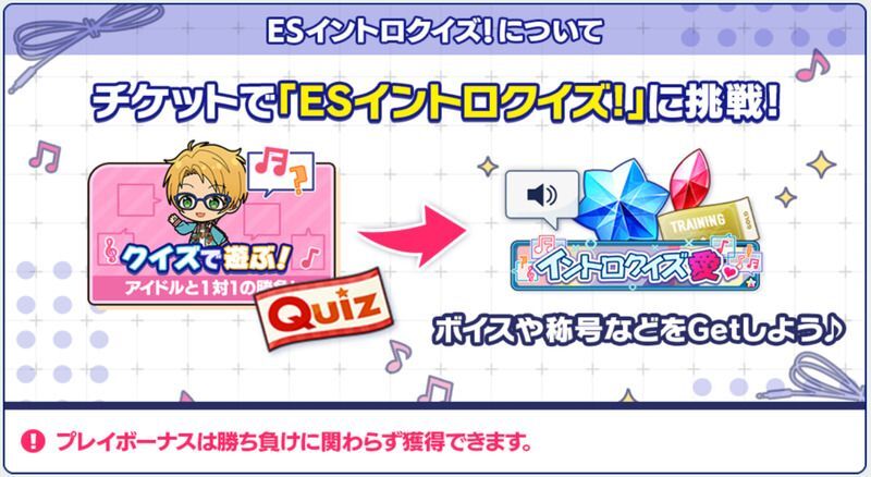 期間中、フェスプロデュースやお仕事でGETした「クイズチケット」で、ESイントロクイズに挑戦できます♪
