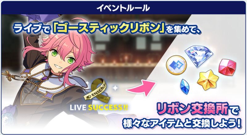 ライブ達成時に確定ドロップする「ゴースティックリボン」を一定数集めると「リボン交換所」よりダイヤや各色ステータスピース・ジュエル、育成チケット、ESコイン、夢コイン、スターメダルなど様々なアイテムと交換できます。