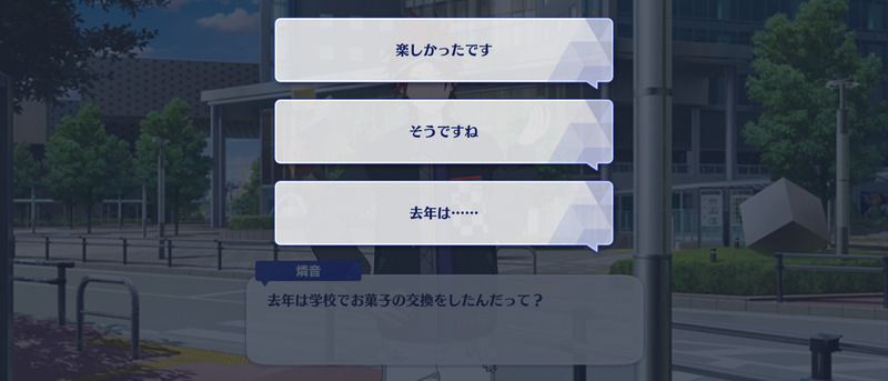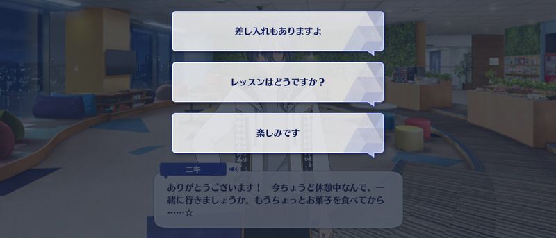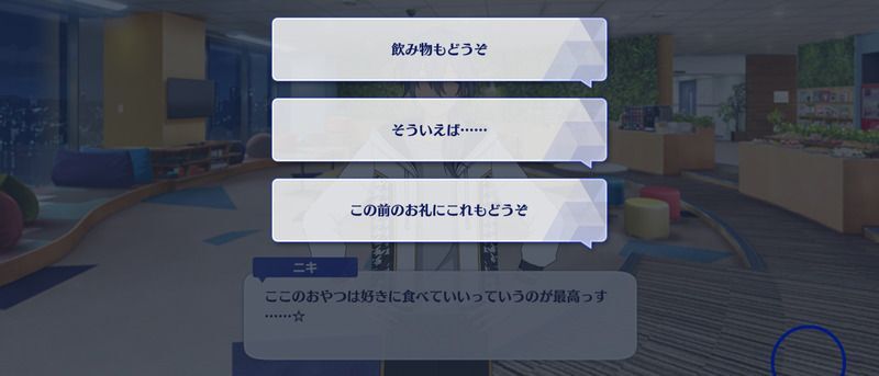 | 3 | ありがとうございます! 今ちょうど休憩中なんで、一緒に行きましょうか。もうちょっとお菓子を食べてから……☆ | ||