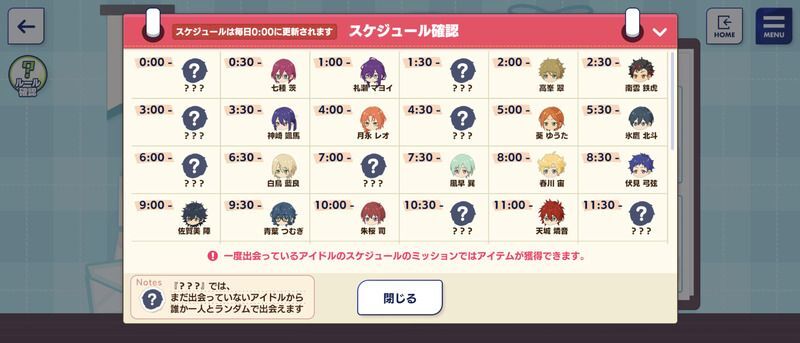 | 挑戦できるスケジュールは30分ごとに追加されます。 アイドルに出会うとボイスをGET! 各ミッションの挑戦期限は60分間です。 | |