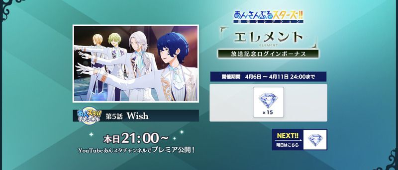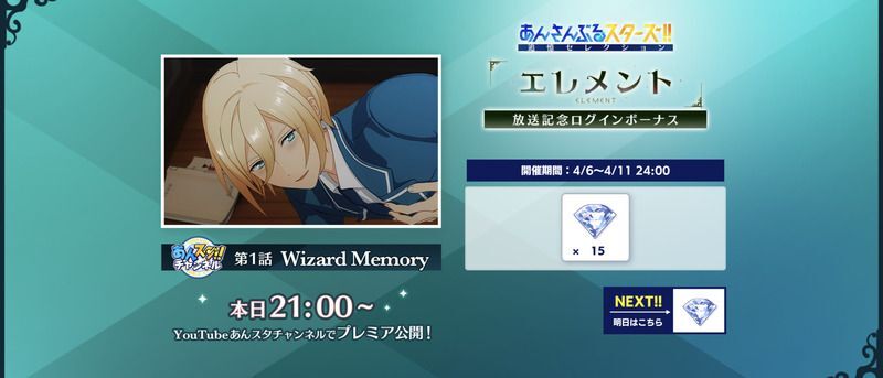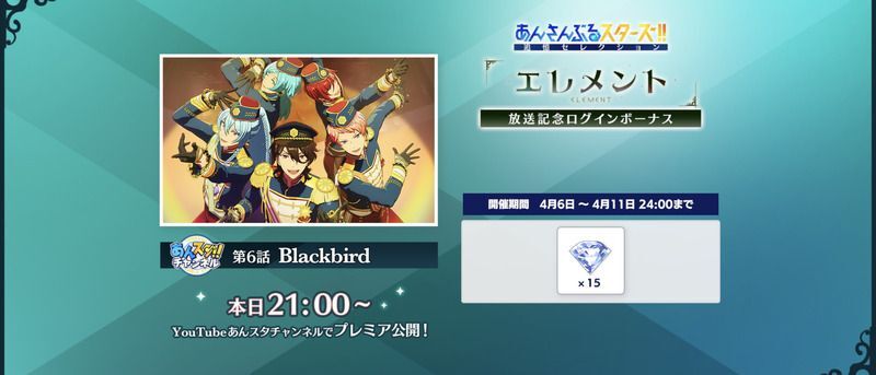 公式YouTubeチャンネル「あんスタチャンネル」にて追憶セレクション「エレメント」の6日間連続公開を記念してログインボーナス開催されます。