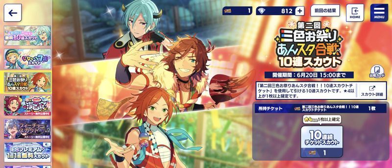 第二回 三色お祭りあんスタ合戦!!の総合順位に応じて獲得した「第二回 三色お祭りあんスタ合戦!!10連スカウトチケット」を使用して引ける10連スカウトです。