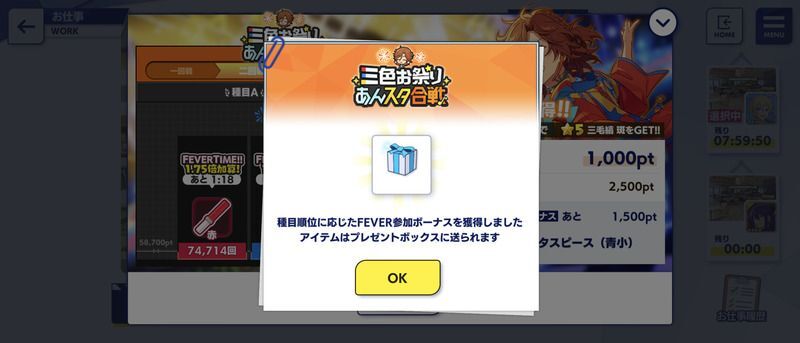 | 毎日12:00~12:30、20:00~20:30「FEVERタイム」が発生! 順位に応じて獲得できるチームスコアがアップします。 また、FEVER中にいずれかの種目で貢献度を獲得すると、初回ボーナスとしてアイテムを獲得できます。 | |
