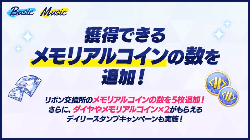 1日1回ライブ依頼を成功させるとスタンプを獲得でき、集めたスタンプの数に応じてダイヤやイベントメモリアルコイン2枚を獲得できます。
