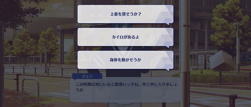 | 1 | この時期は外にいると肌寒いっすね。早く中に入りましょうか | ||