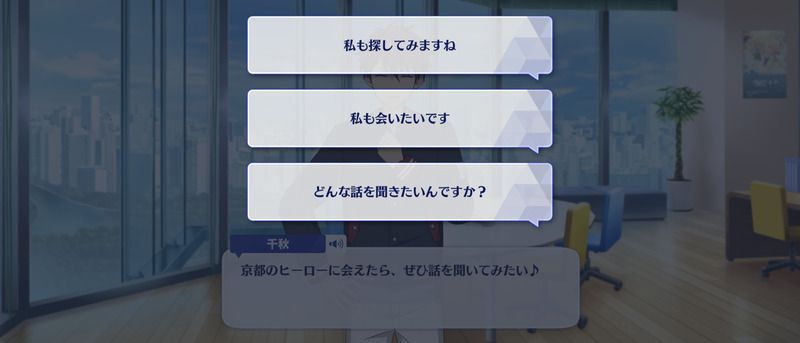 | 3 | おや、(名前)さんも千秋さんから相談を? ふふ、俺もお仲間に加えさせていただくことになり、楽しみにしているんです | ||