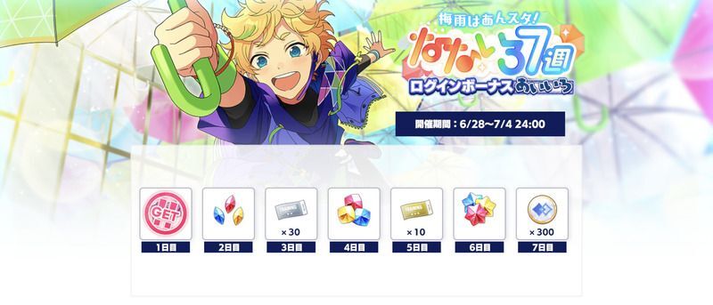 『あんスタBasic(あんさんぶるスターズ!!Basic)』のログインボーナス「梅雨はあんスタ!なないろログインボーナス」詳細です。獲得ボーナス(報酬)や開催期間をまとめています。ぜひ参考にしてください♪