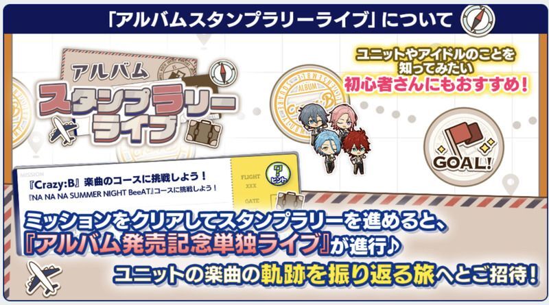 | ユニットやアイドルのことを知ってみたい初心者さんにもおすすめ! ミッションをクリアしてスタンプラリーを集めると。「アルバム発売記念単独ライブ」が進行♪ ユニットの楽曲の軌跡を振り返る旅へとご招待! |