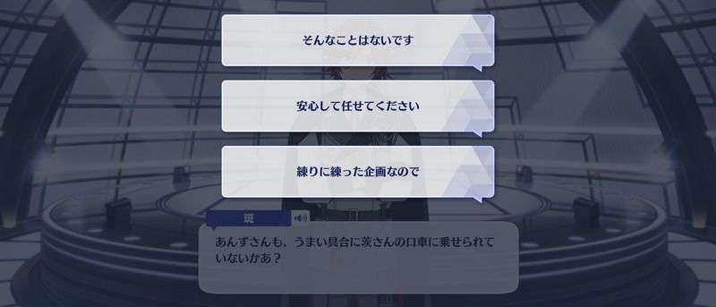 | 3 | (名前)さんもTV局に行くのかあ? それなら一緒に向かうとしよう | ||