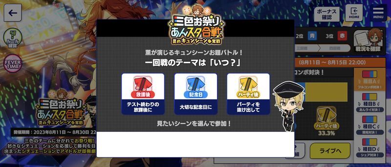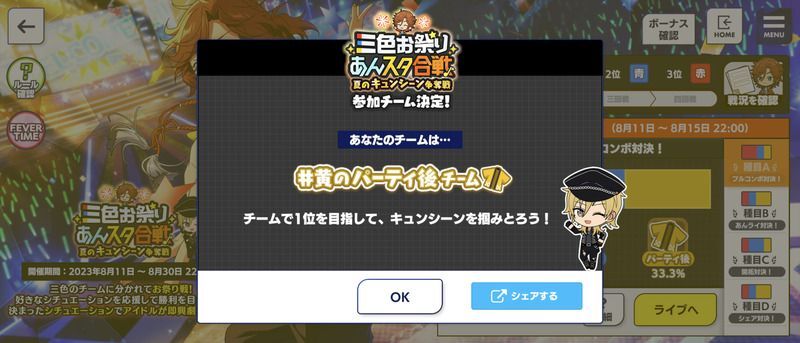 | 三色お祭りあんスタ合戦!!〜夏のキュンシーン争奪戦〜で特定のチームに参加する | |