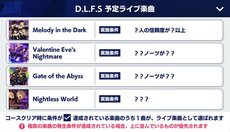 | D.L.F.S. 予定ライブ楽曲 | 実施条件 |