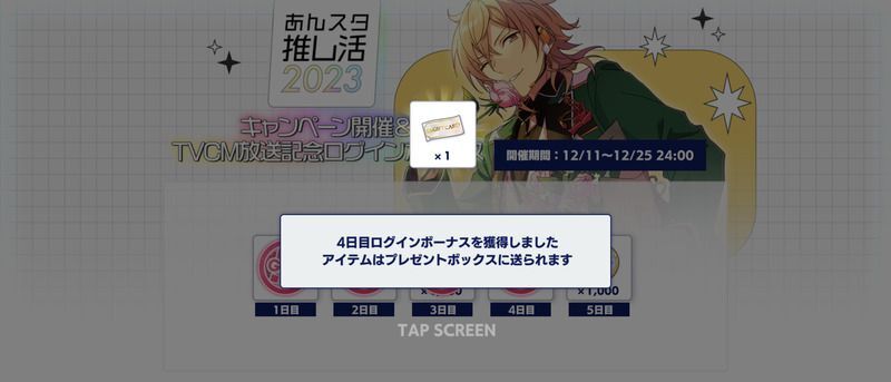 クリスマスショッピング大作戦!!for PARTYのミッションクリア報酬、あんスタ推し活2023キャンペーン開催&TVCM放送記念ログインボーナスの累計2日目・4日目のログイン時に獲得できます。