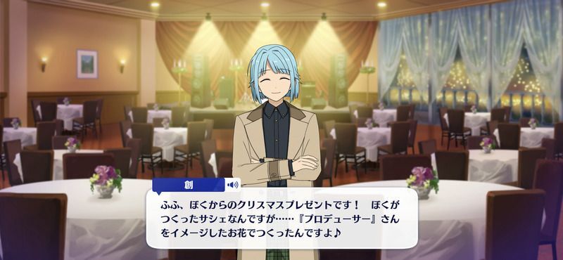 | ふふ、ぼくからのクリスマスプレゼントです! ぼくがつくったサシェなんですが……『プロデューサー』さんをイメージしたお花でつくったんですよ♪ | |