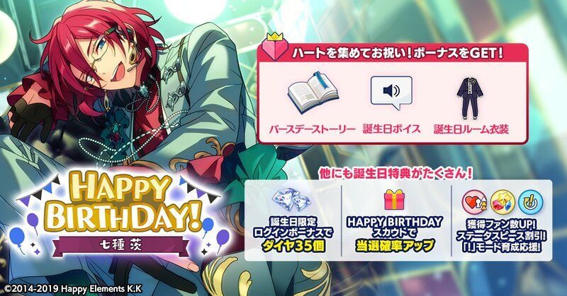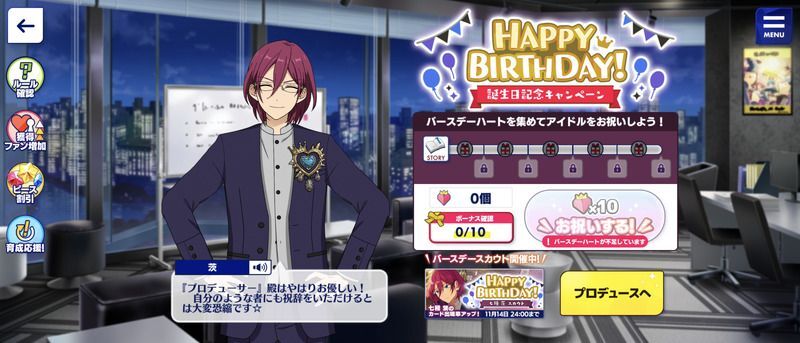 誕生日のお祝い回数に応じて、「誕生日限定のミニトーク」、「誕生日ボイス」、「誕生日ルーム衣装」などのボーナスを手に入れることができます。