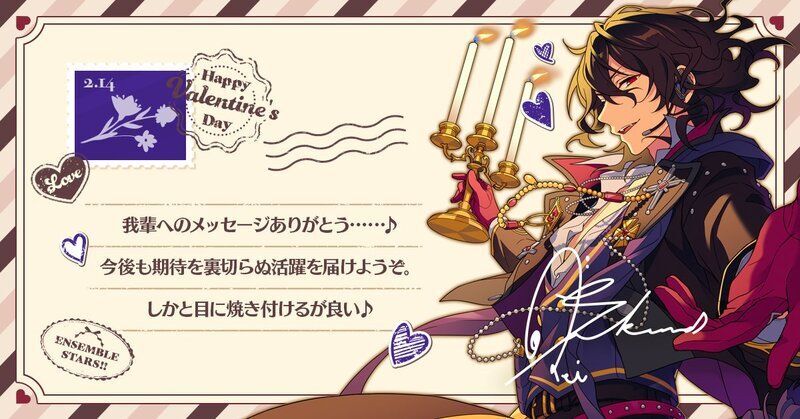 | メッセージありがとう! すっごく嬉しいよ! きみの声援に応えられるように、俺ももっともっと輝いていくから、これからも応援よろしくね……☆ | |