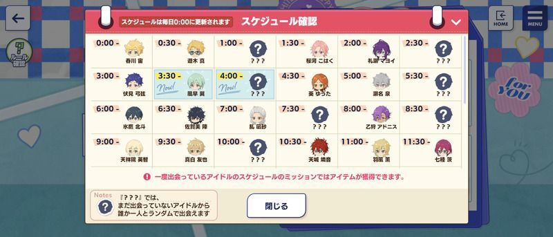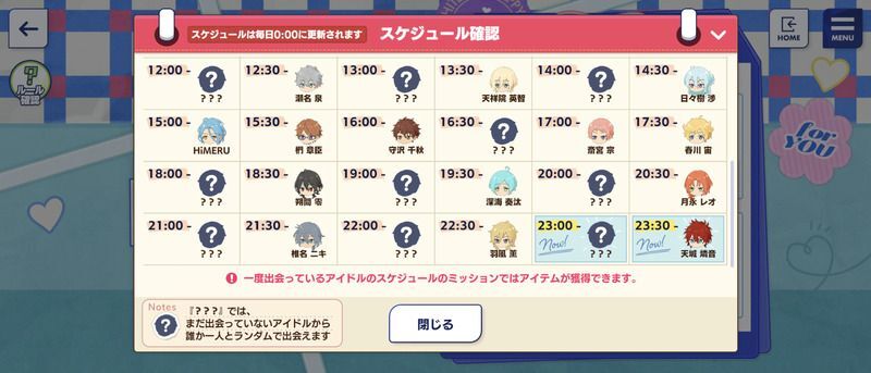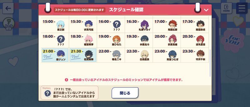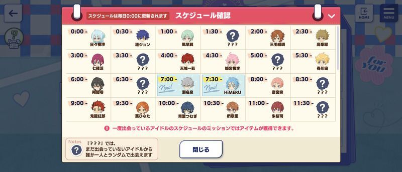 | ???は出会っていないアイドルがランダムで抽選されますが、現時点で挑戦できるミッションのアイドルが抽選される場合もあります。確実性を上げるためにもアイドルのミッションを優先してのクリアを推奨します。 | ||