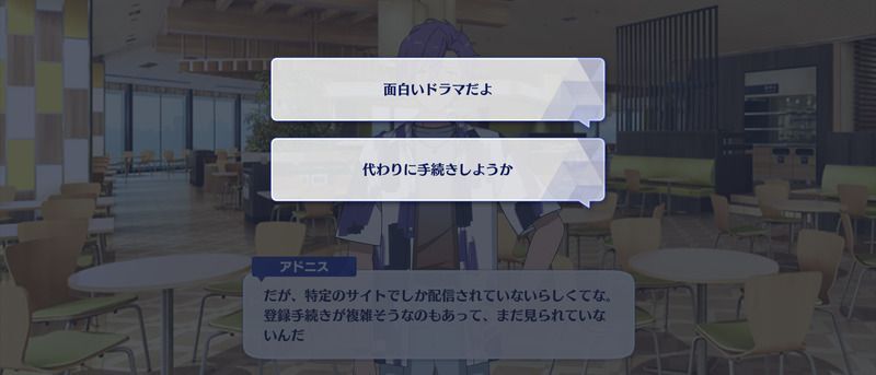 | 1 | だが、特定のサイトでしか配信されていないらしくてな。登録の手続きが複雑そうなのもあって、まだ見られていないんだ | ||