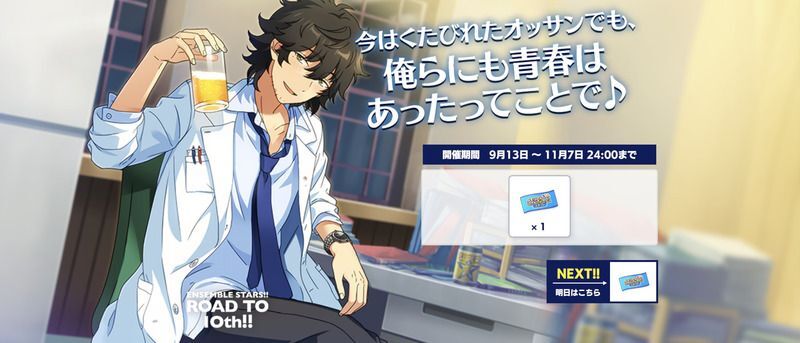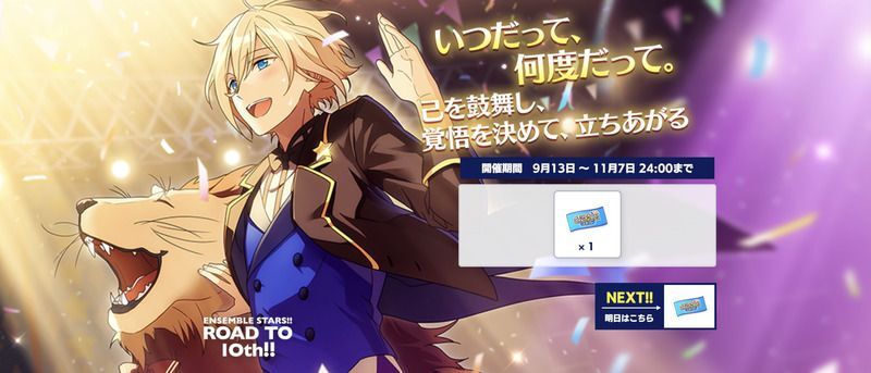 | 10月11日 | メモリアルログインボーナス第一弾スカウトチケット×1 躍進!夜明けを告げる維新ライブ |
