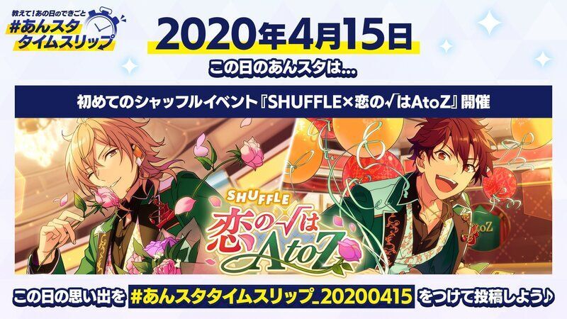 | ① | 2015年4月28日の思い出とハッシュタグ「#あんスタタイムスリップ_20150428」をつけて投稿! |