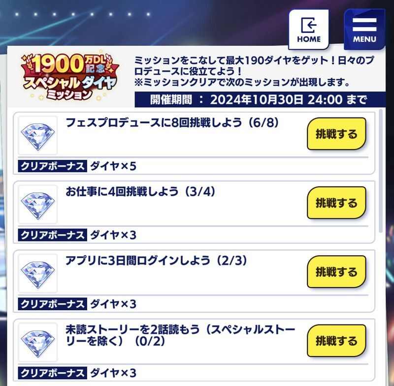 | ホーム画面左下の「MISSON」アイコンから「1900万DL記念スペシャルダイヤミッション」へアクセスし、ミッションを確認してください。 ▶ミッション一覧情報はこちら | |
