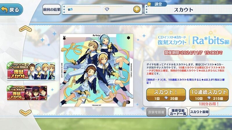 「あんさんぶるスターズ!」ユニットCD第三弾のジャケットイラストを使用した「Ra*bits」の『限定CDイラスト★3カード』が出やすいスカウトです。