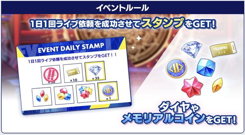 1日1回ライブ依頼を成功させるとスタンプを獲得でき、集めたスタンプの数に応じてダイヤやイベントメモリアルコイン1枚を獲得できます。