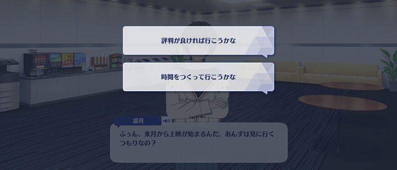 | 3 | ふぅん、来月から上映が始まるんだ。(名前)は見に行くつもりなの? | ||
