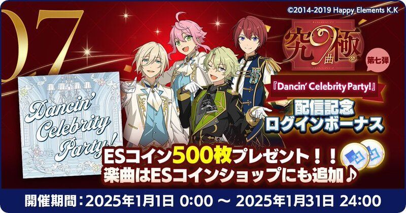 バラエティソングシリーズ究極の9曲 第七弾『Dancin’ Celebrity Party!』の全世界一斉配信を記念してESコイン×500がプレゼントされます。