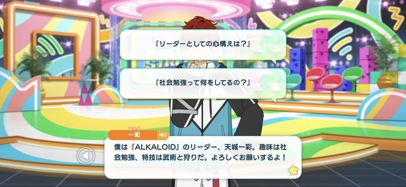 | 3 | 僕は『ALKALOID』のリーダー、天城一彩。趣味は社会勉強、特技は武術と狩りだ。よろしくお願いするよ! | ||