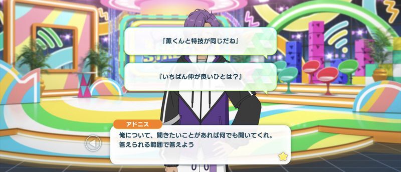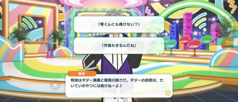 | 3 | 燐音はんは『Crazy:B』のリーダーや。趣味はギャンブル、特技は勝負ごと。ほんま根っからの勝負師なんよ | ||