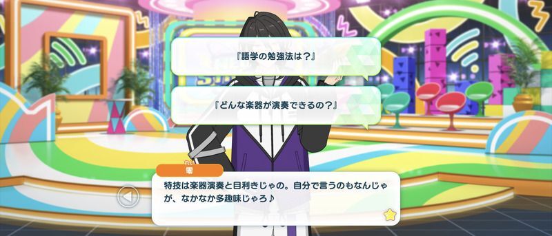 | 1 | 特技は楽器演奏と目利きじゃの。自分で言うのもなんじゃが、なかなか多趣味じゃろ♪ | ||