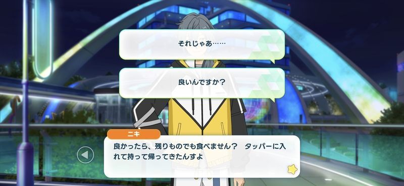 | 2 | 良かったら、残りものでも食べません? タッパーに入れて持って帰ってきたんすよ | ||