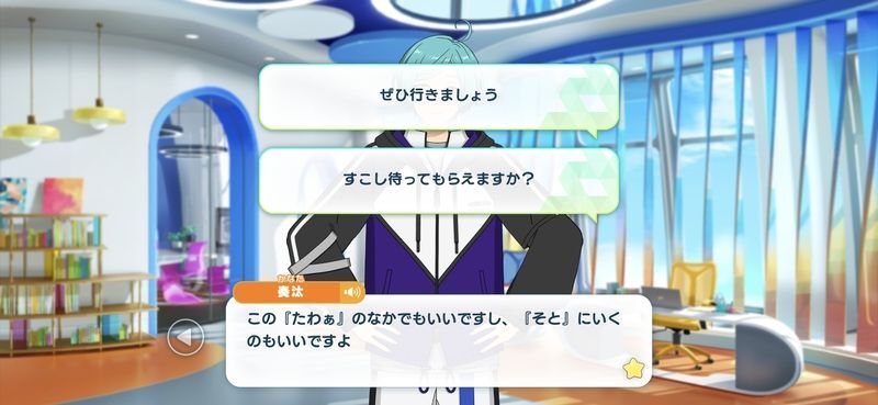 | 1 | 僕もこれから部屋に戻るところなんすよ。気がついたらこんな時間になっちゃってたっす! | ||
