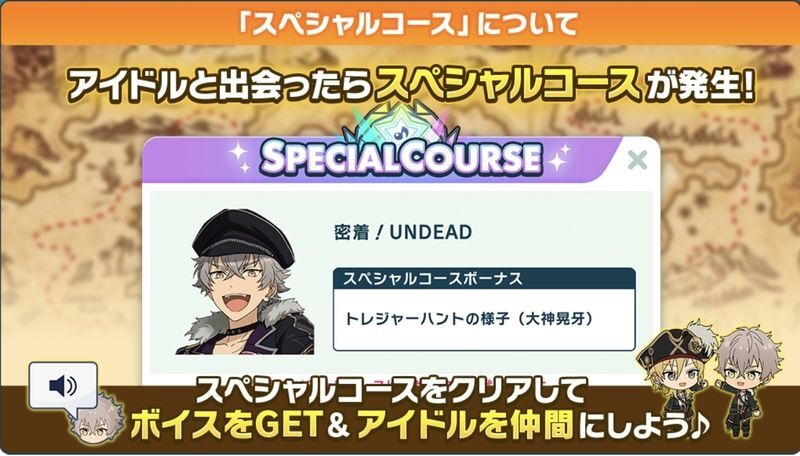 | アイドルと出会ったらスペシャルコースが発生! スペシャルコースをクリアしてボイス「トレジャーハントの様子」&アイドルを仲間にしよう♪ | |