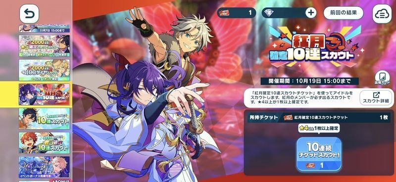 記念ミッションで獲得した「紅月確定10連スカウトチケット」を使用して引ける10連スカウトです。