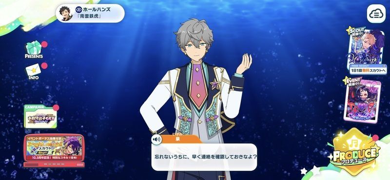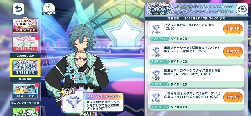 | ホーム画面左下の「CAMPAIGN」アイコンから「2000万DLCP」>「プロデュース大応援!2000ダイヤミッション」へアクセスし、ミッションを確認してください。 ▶ミッション一覧情報はこちら | |