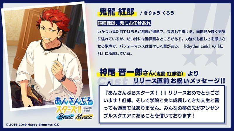| 『あんさんぶるスターズ!!』リリースおめでとうござざいます! 紅郎、そして学院と共に成長してきた人生と言っても過言ではありません。みんなの夢の先がアンサンブルスクエアにあることを信じております! |