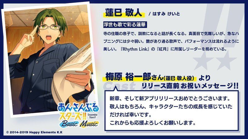 | 新章、そして新アプリリリースおめでとうございます。敬人はもちろん、キャラクターたちの成長を感じていただければ幸いです。 これからも応援よろしくお願いします。 |