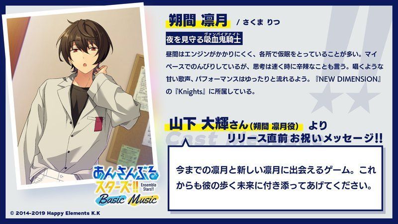 | 今までの凛月と新しい凛月に出会えるゲーム。これからも彼の歩く未来に付き添ってあげてください。 |