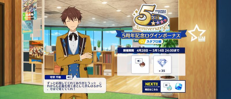 | 05月11日 | ボイス「五周年の挨拶」 ダイヤ×35 |
