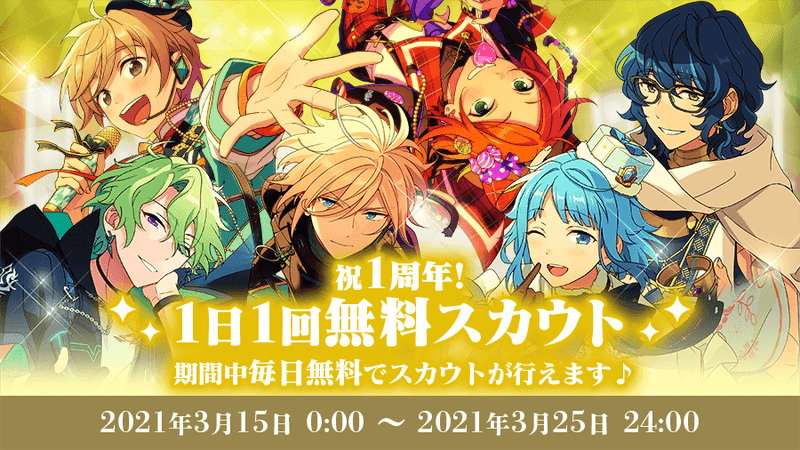 | 開催期間 | 2021年03月15日 00:00 ~ 03月25日 23:59 【開催期間が延長!】 2021年03月15日 00:00 ~ 04月18日 23:59スカウト回数は毎日0時リセット |
